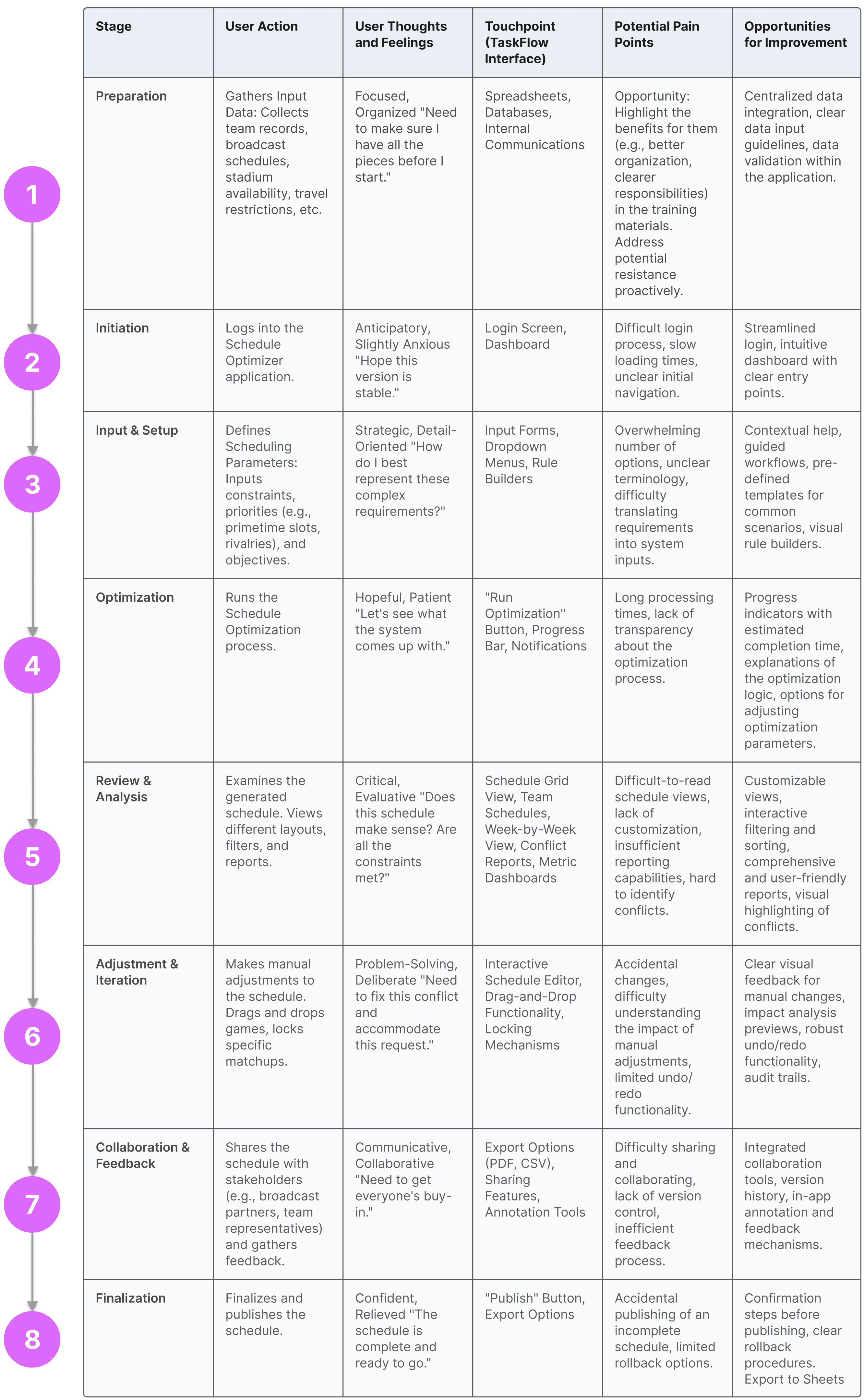 Create a user experience that is seamless and easy to use: The schedule optimizer tool should allow the scheduling team to run example scenarios by entering key parameters and let the AI in the application run a number of selected scenarios.