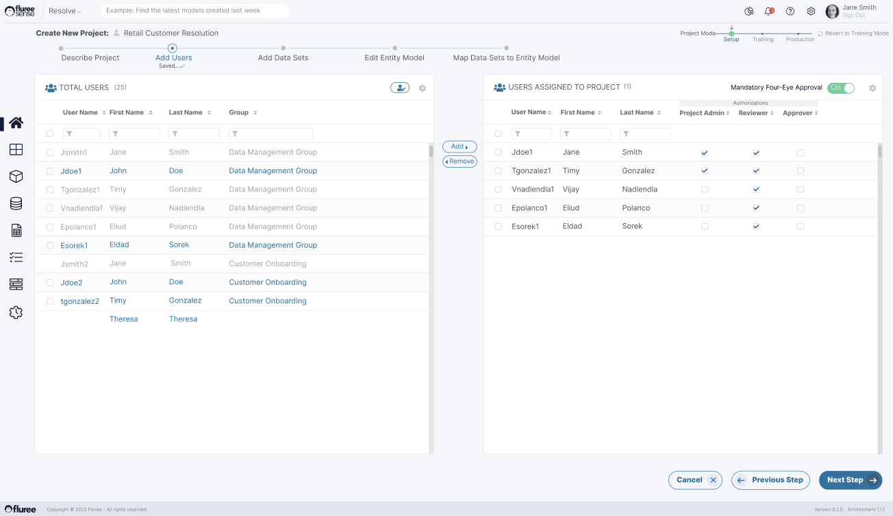 Using a two-panel layout, the user adds additional team members to this particular project. At the same time, the user provides proper authorizations and roles to the individual project members.
