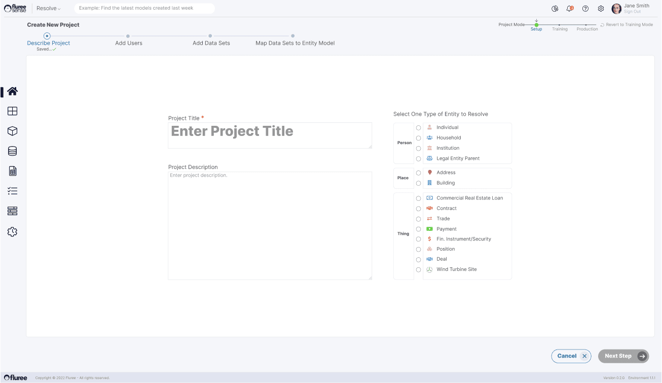 The user clicks on Project > Create a New Project and enters the project name, project description, and selects the entity to be resolved.