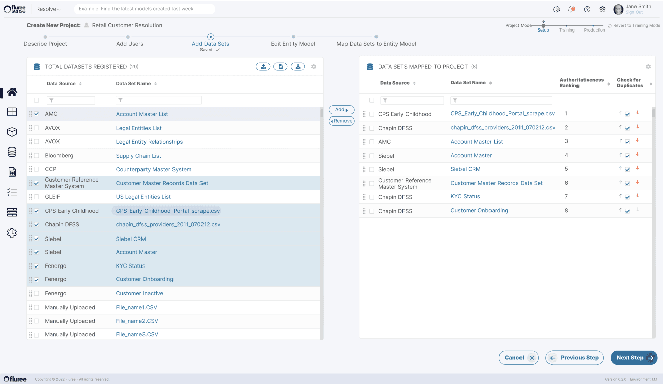 Using a two-panel-layout, the user adds one or more data sets to the project. The user can also change the authoritative ranking for all the data sets selected.