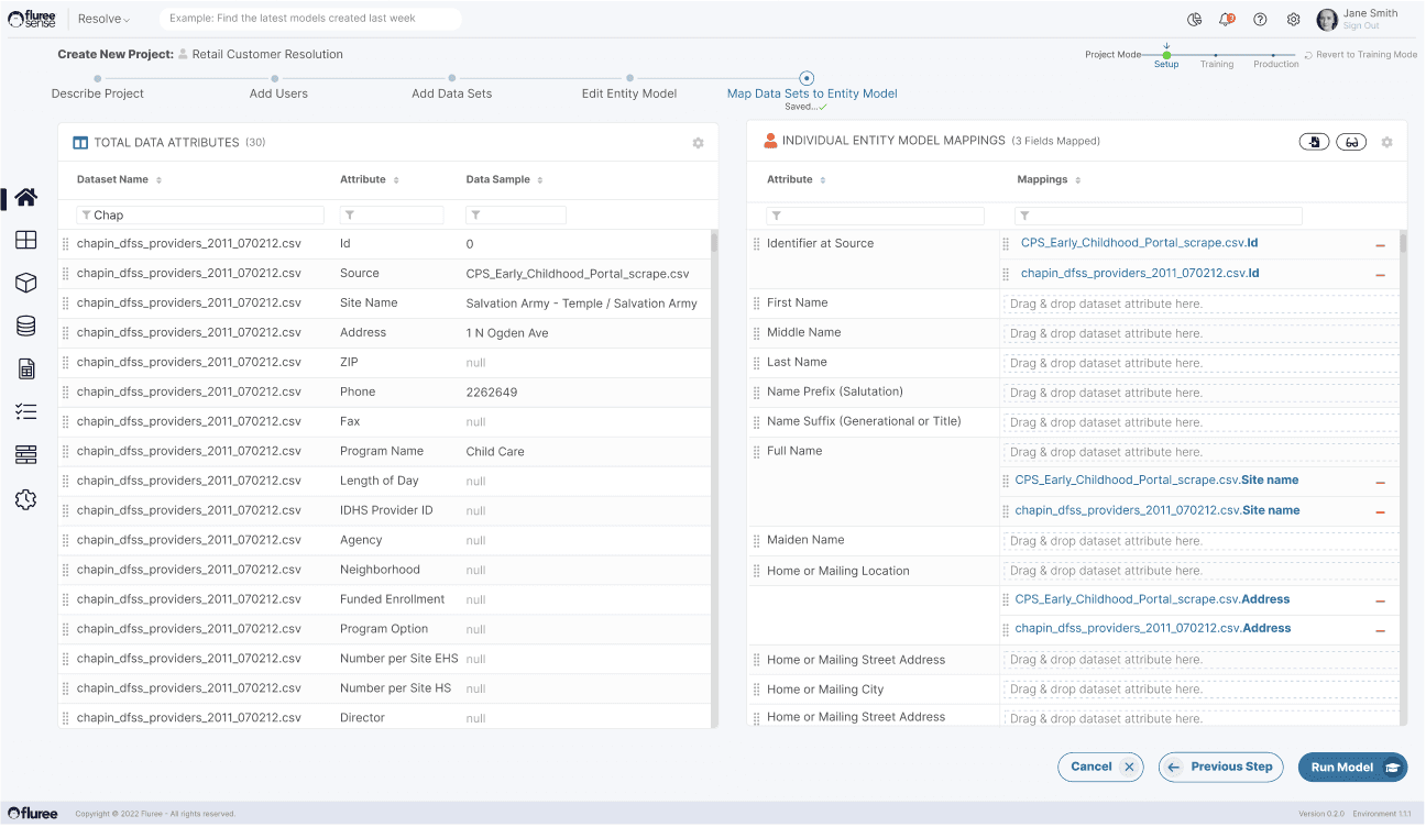 Using a two-panel layout, the user maps the entity model, using a drag-and-drop pattern, for each attribute of the data sets. The mappings have a different visual treatment for better visual identification.